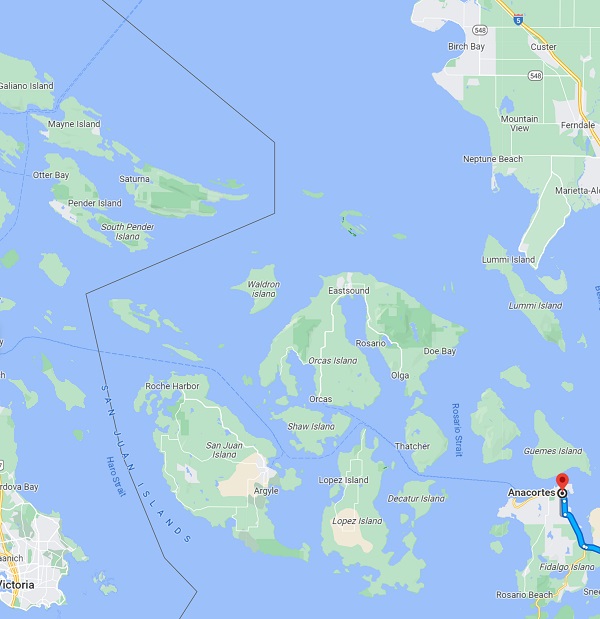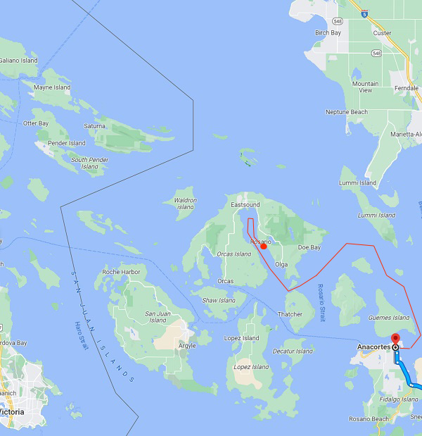 I connected with Captain Rod, the instructor for the course, a couple days prior. Or rather he connected with me. The reason was that the transmission in the boat had failed, and needed to be replaced. It wasn't clear that the replacement would arrive in time and there was a possiblity that the voyage would have to be delayed or canceled. I indicated that I'm flexible on departure date, and that I had planned this as a birthday gift to myself. Long story short, there were options but eventualy it was confirmed that the new transmission arrived and would be installed in time. I chose to get up early on the day of and drive in the morning, chancing rush hour through Olympia/Tacoma/Seattle along the way. Upon 5am departure the GPS puts ETA at 9:22am. Long drive, much traffic, some 10+ over the limit cruising, and I arrive at (ready?) 9:22am. To the minute. I'll just take it as sign of the times and won't read too much into it. This is the area I will navigate over the next 5 days. Slowly.