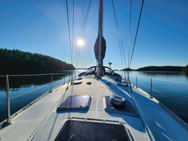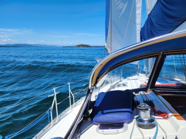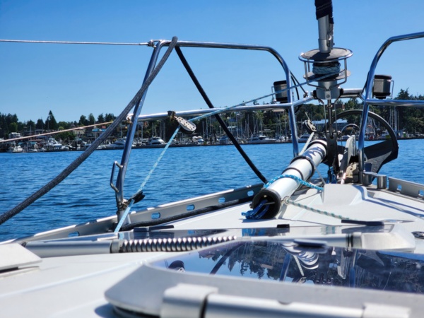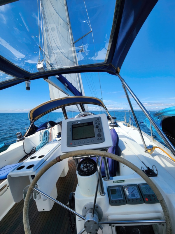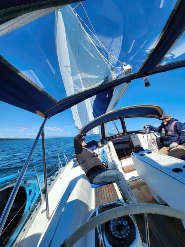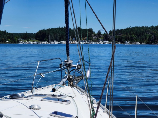 Day 5 - ASA104 on-water In the morning, the skies are mostly clear and there is some wind. Not a lot but enough to bother raising the sails and practicing more of the routine boat handling. The Captain sets timer for half hour stints at the helm, so Scott and I get to experience being at the helm and crew in a variety of situations. Sometimes we do resort to the engine.