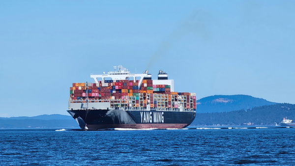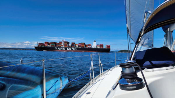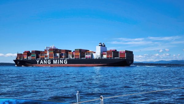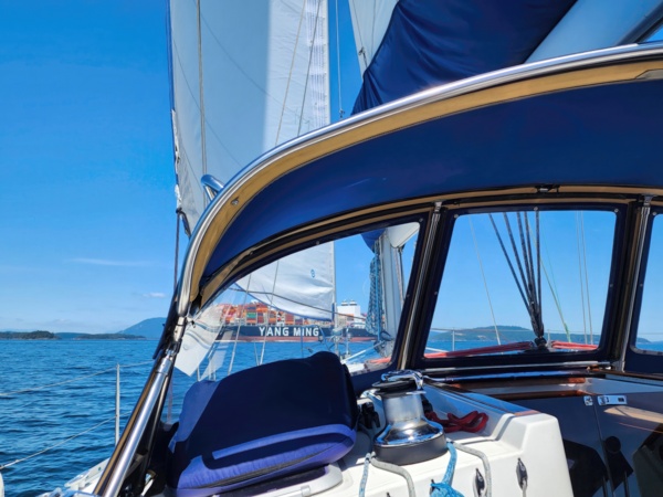 At one point we spot a container ship far away. But it moves way faster than we do, so we just hold the course figuring we'll be far behind it when our tracks intersect. And that proves to be the case. The ship is sitting high in the water which leads us to speculate that a good portion of the containers onboard are empty, being taken back to be refilled. True to his sense of humor that we've come to appreciate, Captain Rod remarks "that ship looks French". Lol.