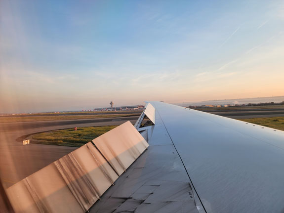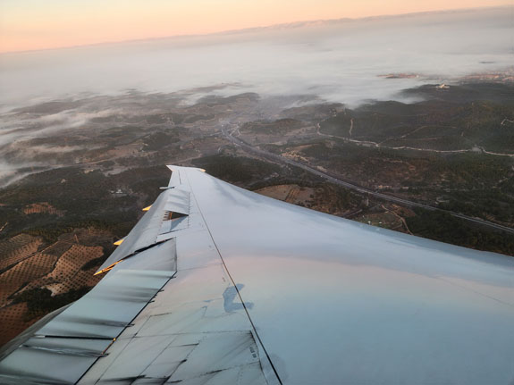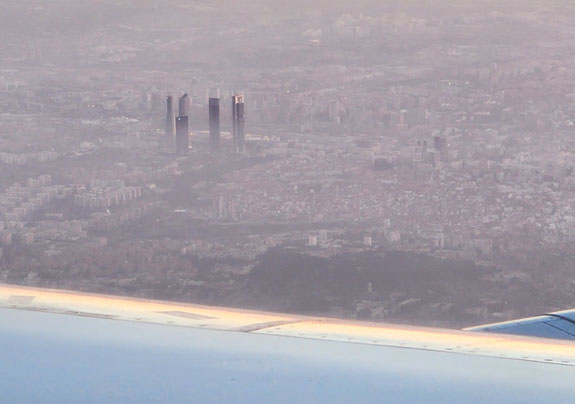 Day 1 - arrival in Madrid and drive to Porto. On approach to Madrid at 9 AM local time, there is a thin layer of fog on the ground but it's clear overhead. A handful of skyscrapers poke through the fog.