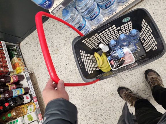 The hybrid basket/cart is brilliant - surprised I haven't seen this anywhere else before. It has small plastic wheels but is easily lifted and stacked as needed. Two bottles of wine, 4 waters, some ham, bananas, sausages... all for $16.