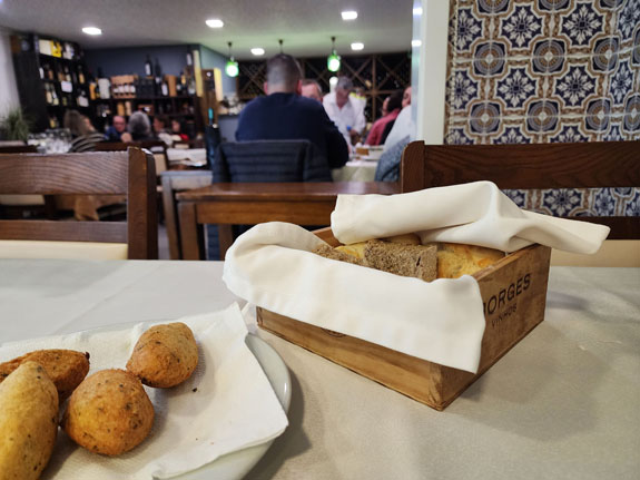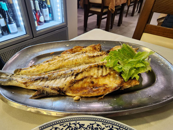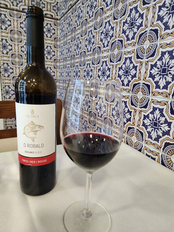 Most restaurants close at 10 PM but I do find an open one near the hotel. I'm not really hungry, having consumed my daily allotment of Zone bars and the ham I bought, but I want the experience. Robalo (sea bass) seems to be a local specialty. It is also the name of the restaurant, and its house wine. So that's what I order.