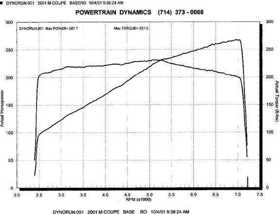 Interesting how such a simple thing can increase the enjoyment of driving the car by so much. I should really swap the steering wheel too, but not quite ready to lose the airbag yet... 8/12/01 Got the new G-Tech accelerometer and decided to test it out. Found a flat, straight piece of road, reset the device and floored it. The result: 5.1 sec 0-60 and quarter mile in 13.4 at 114 mph. Considering I still had traction control on it's not bad at all. 10/04/01 Picked up and put on the new Kumho V700 tires, the rears being a bit larger than the original ones. These are very sticky and should last all of 5000 miles (about a year for me, I hope). Maybe this would give the traction control some relief :) The car certainly feels a lot more planted and 'livelier' on the new rubber. Significantly better confidence in turns. I don't care if it lasts 1/4 as long as stock tires, it's 4 times more fun! Well, at least until it starts raining.... Also, while at the shop I popped the coupe onto the dynamometer to see what power it actually develops. The result is rear wheel HP of 267.7 at 7100 rpm (would be more if the guy ran it to redline, since the power was still climbing at that point). This translates to 314.9 HP at the engine - right in line with manufacturer claims. Torque curve is amazingly flat. Cool!