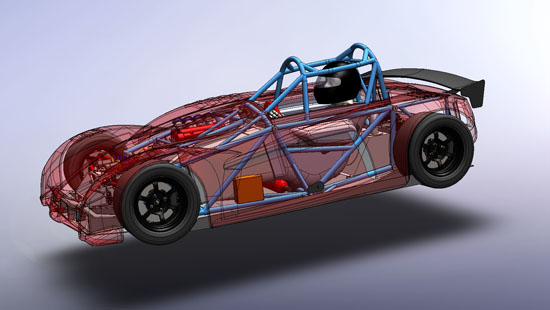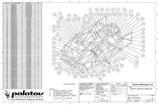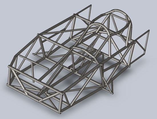 The weight penalty vs the standard car is only 20 lbs overall, including rollcage and other reinforcements. For people intending on using our cars in hillclimbs (rocks, trees, cliffs) the beefed-up structure is a good option and we will offer it as a regular production item. First order of business is to generate the detailed CAD files for each tube that's different from the racetrack frame and then we can order the tube set. Our goal is to have something put together that starts resembling a car about a month from now. So far we're right on schedule with the timeline but it will take some considerable effort to keep it so. We're committed to doing what it takes. February 16, 2012 Things are moving forward. The detailed frame design is done, now it's off to be made. There are 100 separate tubes and each one needs to be individually documented. About 130 lbs total weight, not too bad considering the beefy structure.