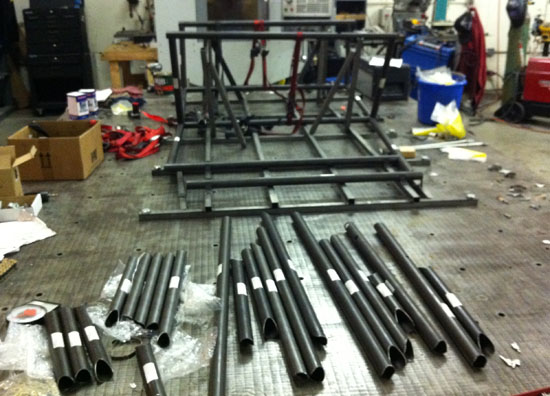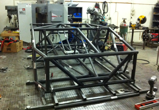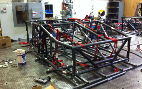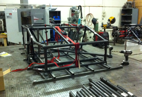 Yes, the picture is intentionally blurry and no I won't go into the specifics here - this is just an illustration of the kinds of data available. The traces from top to bottom are engine revs, speed, lat/long g load and gear selection. Lots of other parameters are avaialble too but of course to have any accuracy the input data has to be quite good. In this case we're just looking for trends and apples-to-apples tradeoffs. We can see what percentage of time the engine spends in various rev ranges, what gears are used and how often, what (theoretical) speeds are reached and so on. Then we have to make reality checks - just because the sim says the car will go through a corner at 140 mph, in real life the cliffs and potential for gravel may dictate otherwise. Overall so far the simulations have been very educational and we're close to finalizing the choices. I've already made changes to the gearing based on data from the sim. While on the subject of sims, here are a couple more thoughts that are not directly related to the current stage of development but are good to keep in mind: A sim can teach you a lot about how you drive, paradoxically by depriving you of some senses - the 'seat of the pants'. There are some synthetic feedbacks being generated - sound, force feedback in the wheel and in some fancier rigs even motion. But one has to be careful because generally no feedback is better than bad feedback. Here's an example - let's say you put perfect earplugs in which blocked all the sound. You can adapt to that and after a bit use other senses to compensate. But now imagine that instead of earplugs you got headphones which pipe in sounds kind of related to what's going on around you but all wrong. There's no adapting to this except to tune it out and rely on other senses instead, but it's extra work. So how can a sim teach you? The most important thing to realize is that high-performance driving is all about ANTICIPATING, PLANNING and EXECUTION rather than REACTING. Talented drivers do it intuitively, the rest of us have to do it consciously to be any good. Normally, seat-of-the-pants inputs provide you with feedback that let you know what's happening and help you REACT. Which, in an unknown environment, is very useful. But the key is that a track is a known environment, to go fast you have to have it all pre-programmed, preloaded and just click off queued tasks based on triggers such as brake markers and other reference points. If you're reacting you're too late. Soo... by depriving you of inputs that feed reactions a sim can force you to plan, anticipate and execute BEFORE things happen. It takes a bit of introspection and self-analysis (and treating a 'game' as work, which is counter-intuitive and not always fun) to benefit from this but it's well worth it. After gaining proficiency in the feedback-limited sim and jumping back into real life, the full benefit of live sensory feedback becomes clear - it is there to give you additional information about how your plan is progressing so you can employ some ready contingencies as needed. Because a real working plan is never static. It's a constantly moving target and contingencies are what lets you stay on it while inputs help you choose. You pitch the car into a corner intending for the back end to step out and then wait for it to happen so the next part of the plan (acceleration) can commence at just the right moment, already thinking several steps ahead. As opposed to going into a corner then being surprised by the back end stepping out and scrambling to react with all focus on just getting through it and no thought of what comes next. This of course applies to design just as much as it does to driving, and simulation can be equally helpful there. When used right. Our goal is to show up on the Mountain with a plan ready to execute and as many contingencies as we can manage. To that end we've teamed up with Simraceway - there are lots of synergies in what we're doing and I'm very excited about the potential of this relationship. More on that as things develop. March 16, 2012 There is a lot of progress on all fronts. The most visible is the frame itself - it's coming together quickly.