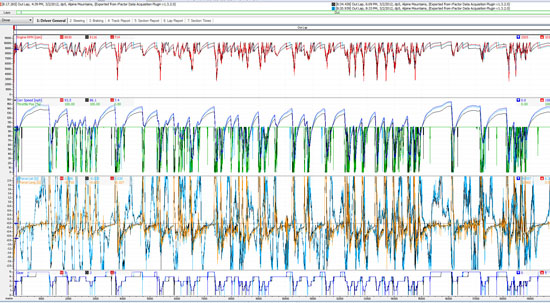 I've used the bigger S80 DTA computer on the D1 (and on the V8 Atom before that) so I'm familiar with the product and how to set it up and tune it. It's good to have some known things in the mix :) We will start assembling the suspension this coming week and welding the frame shortly after that. There are some things I need to do for the engine (design/machine different endplates and bellhousing to mate it to the gearbox) and of course have to design and build all the plumbing and valving for exhaust/intake/turbo setup. We'll be using a large intercooler and it's scheduled to arrive in the next couple days. Once that's here I can get it in CAD and start on the packaging in earnest. March 3, 2012 Over the years I have found that computer simulation is a very valuable development tool, when used properly. This includes CFD, FEA and in this case Driver-In-The-Loop simulation (DIL). Basically DIL simulation is what people think of as video games but there is a difference. While console and arcade games actually have a lot of very sophisticated computing at work, their design criteria are fun and player engagement. Therefore accuracy is deliberately sacrificed for entertainment (think Hollywood). But there is a class of programs out there which are generally referred to as 'racing sims' that harness the power of today's PCs to deliver a good deal of accuracy. Yes, this makes them harder to master and at times more work than fun but for the dedicated enthusiast (or racer) there is a lot of value in it. So in this post I want to talk a bit about simulation and how we're using it. But first, some background. Whenever doing simulation of any kind you have to accept that the simulation is just that - it is not reality and is only useful for development purposes when the limitations and assumptions are understood and accounted for. It is very tempting when the computer spits out a number such as a particular lap time to take it as fact. Afterall, look at all those decimal points... But one has to look beyond the numbers and put them in context. There are many aspects of it and I'll only touch on a couple of them here. One way to look at a sim is a series of very complex real-time engineering calculations. It is common engineering practice to calculate loads and forces for a given static condition. A sim does this literally billions of times a second for every inch along the track, and it does what no traditional engineering calculation could - take actual human driver input as part of the equations. When looked at in this light the value is quite obvious. There is even a way to keep track of all the data and analyze a test 'run' in detail that only F1-level teams with annual budgets in tens or hundreds of millions have access to in real life. The catch of course is that it isn't real, so all data gathered must be interpreted carefully. One specific example is our effort to select a turbo configuration for the car. We have a reasonably accurate version of the paved Pikes Peak track in the sim (will have a much better one later, more on that when the time comes). We also have our car's physics loaded and we've gotten some calculated torque curves from a turbo expert at Garrett Motorsports based on our specific parameters. Using all of this we did several virtual test runs up the mountain with different turbine and compressor configurations, to see what effect the various tradeoffs have on the overall time. A sample set of plots is below.