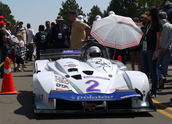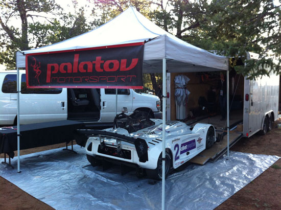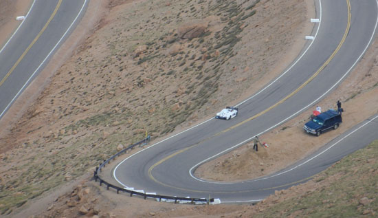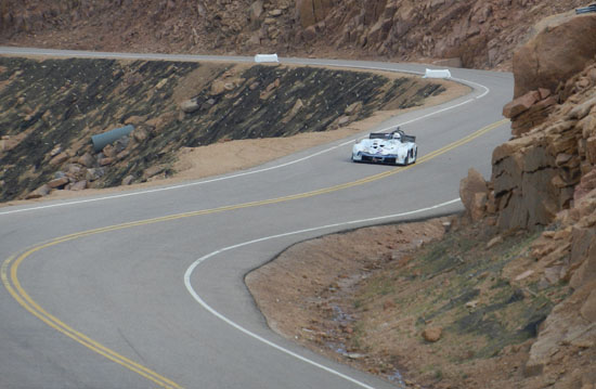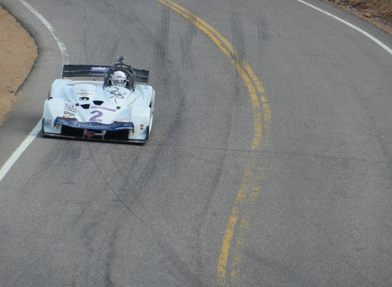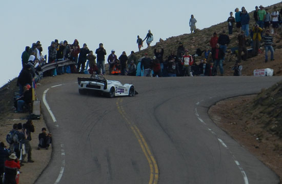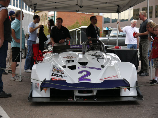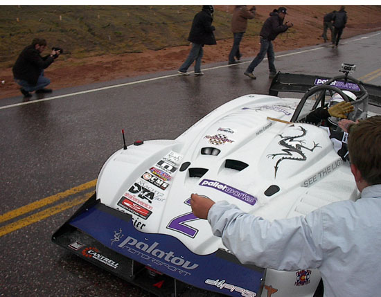 David Donner drove our D4 PPS to a first-place finish in the Unlimited Class of the 2012 Pikes Peak International Hillclimb. We placed 5th overall (out of over 160 competitors from all over the world) with a time of 10:04.652 which is only 18 seconds off the new overall record. Below are the events of the last two days leading up to it and the race itself. August 10, 2012 Today we test on the middle section from Glen Cove. It's one of our favorite spots on the course and you can see almost all the way up to the summit. In the morning the parking lot is crowded so we just set up right in the middle. We get three runs, mostly to give David more time to get used to the car. The runs are uneventful. The Geartronics shifter is working well but some items in the drivetrain will need a bit of maintenance before the race. Once we're back at David's shop, Tristan, Surjan and Bromley spring into action. They take things apart, replace some components with spares and make a few adjustments. We decide that it would be a good idea to do one more test at PPIR so David arranges that. One of the goals is to try and find some more downforce. In our earlier testing in Oregon we had gone from virtually no downforce to around 400 lbs at 100mph but we need much more to give David the confidence he needs to push the car in the bumpy high-speed sweepers of the top section. Quite coincidentally David happened to have some old BMW F1 wings laying around the shop and one of them looked like it was designed specifically for our car, so we installed it. It is strange how well the size and shape of the wing fit with the bodywork contours. The car looks even meaner now. In the evening we head out to the Fan Fest downtown Colorado Springs. We have a booth space reserved and set up the car on display. It's an opportunity to talk to people about the car as well as check out all the stuff going on including other cars, motorcycle stunt riders and so on. I finaly get to see Tajima's electic car and it's monstrous - much bigger than I would have thought from the pictures I saw on the internet. We qualified some 3 seconds faster than him. Some of the other electric and gas cars are here and it's good to check them out.