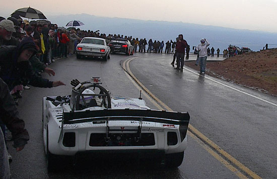 (Pictures courtesy Carey Kriger) Soon we get word that David finished with a time of 10:04. It's a huge relief. Here's a video of the full run, taken with the CMS Lap Timer. We have now done all we can, just have to see what the other competitors do. The black RS200 takes off and his first section time is only a fraction of a second behind ours. But the second section time never comes up and we learn he is off with a mechanical. The 850hp LoveFab NSX makes it to the top but they're about a minute and 30 seconds behind. The second RS200 breaks down and the crazy mid-engine supercharged Chevy truck never starts. So it's official - we win the Unlimited class! Yet another confirmation that to finish first one must first finish. Racing is not only about going fast, it's also about designing, building and prepping the car that can go the distance. We're very happy with the result. We've accomplished exactly what we set out to do this morning. Sure, it would have been nice to break the record on our first try but we'll save that for next year :) It is only mid-day and lots more cars to run. Weather is starting to turn. Millen and Dumas make their runs, with the former wrestling the new record from the latter by a mere 0.02 seconds. They are only 18 seconds ahead of us on a 10-minute run. Not bad although from qualifying times I expect Dayraut would have been faster had he finished. We hear Dumas is not pleased about the run order but hey, if he had read the rules he could have entered in the Unlimited class and ran in better weather. Unless he was betting on qualifying fastest? Who knows. That's all part of race strategy and preparation. We already know that the two Ducati riders are ahead of us in the overall standings with sub-10 times. As much as I admire the skill and courage of top drivers like David, to do sub-10 on a bike up here is superhuman. My hat is off to them! In the remaining car field only the Electrics and Open Wheel are potential threats. Tajima breaks down but Mitsubishi posts an impressive 10:30 and Toyota improves on that with 10:15. Electrics are a class to watch next year but today we're still 5th overall. The atrition is high - some people go off, many break down. Eventually the finish line is moved down to Glen Cove for the last 15 cars in order to beat the approaching darkness. This is the Open Wheel class so our overall standing is safe, although based on qualifying results it most likely would have been anyway. Then the race is done and the cars descend through rain-soaked curves back to the start line.