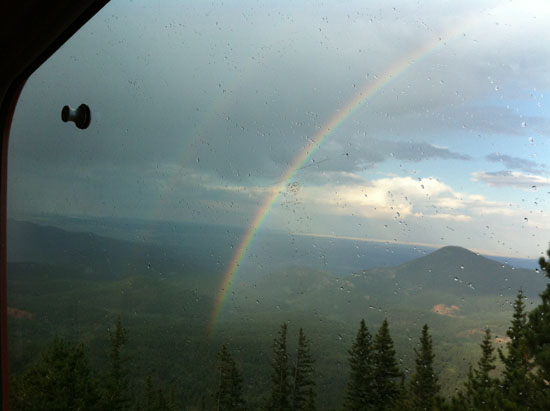 August 11, 2012 The only test time we could get was 6-8am at PPIR. After this week's early morning tests on the Mountain getting up at 5 seems like sleeping in... A few runs allow us to look at the data and figure out what configuration we want to run tomorrow. The wing doesn't add a whole lot (nor was I expecting it to) but it does add something - we'll take it. Some changes to the rear wing net us a few more pounds and we're now as ready as we're going to be. In the afternoon we trailer up to the pits on the Mountain. This year all the cars have to be up the day before the event. Arriving there it is immediately clear that it's an excellent idea - there are lots of competitors, very little space and much confusion. Trying to do this at 3 am in the dark on race day would be a disaster. Soon everything is in place and we take some time to do a touristy thing - ride the cog railway from Manitou Springs to the summit and back. Its 10 mph pace and amazing views are a different perspective on the Mountain. On the way back down we're greeted with a huge double rainbow. I take it as a good sign.