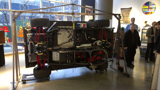 02/15/2013 With the 2012 race well behind us, it is time to make plans for what's next for the Pikes Peak car. One decision we have made is that we are not going to run this year. Last year was a huge effort and it took a lot out of us, including setting our production car programs back a few months. We owe it to our customers to follow through on the D2 and other commitments so this now takes priority. That doesn't mean that the D4PPS will sit idle. We have a comprehensive development program planned and are looking for someone to partner with us in doing so (and own the car). We've put together a brochure that explains the details. Our goal is to be back on the Mountain in 2014 going for a new overall win and record. Meanwhile, an opportunity came up to show the car at the Ryan James Gallery in Bellevue, Washington. I've always thought of my cars as a form of self-expression which in my mind qualifies them as art :) Good to see others agree. So a couple days ago we transported the car up to the venue. Getting it inside proved to be a challenge. The two separate sets of double doors we had to pass through are 65" wide. The car is 67" and it would take some major disassembly to make it narrower (just taking the wheels off wouldn't do it). Fortunately we brought our gantry and some dollies but neither were really meant for moving the car any distance. Still, with some help we got it done.