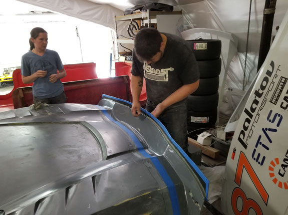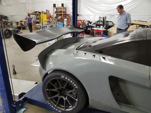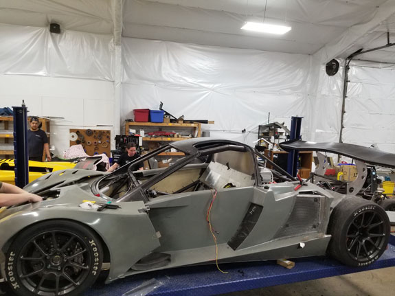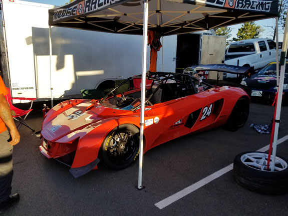 Today is tech inspection, which we pass. Our original plan was to paint the car white (which is the color it will be eventually). It then became the plan to vinyl-wrap it white later in the week. But upon arriving at tech we confirmed our suspicion that we have to go through with the car as it's going to race. So primer grey it is. Doesn't look too bad actually.