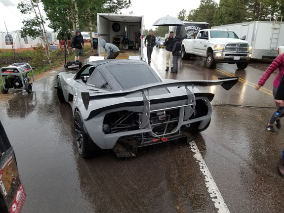 Bikes go first and immediately there are issues and delays - couple crashes and restarts. We were hoping that cars could start as early as 10am but at 11:30 bikes are still going up. The the last one goes up and we wait for the car start. Then the news comes that Carlin Dunne, Greg's many time Ducati teammate and close friend, has crashed and had to be lifeflighted out. There is a considerable delay. When the cars do start running, clouds are already starting to form. Some more delays and by the time Greg is on the starting line they tell us there is rain on parts of the course, so that doesn't inspire confidence. After he took the green flag, the usual longest 10 minutes as we watch the section times. The first one is OK but not great - we're definitely not going to win overall. Next one is better, and the top section is third fastest of all competitors. Looks like the shocks worked and Greg was gaining confidence in the car as he went. Later he told me it was very stable over bumps, despite bottoming out a few times. Definitely great potential, but today we end with a 9:55, second in Unlimited and 9th overall. An emotional rollercoaster for me. But that was nothing compared to what Greg, his family and friends experienced. As Greg sat at the starting line, there was one thing I did not know yet but he already did. His close friend Carlin Dunne had died less than an hour earlier. At that point the official announcement hadn't been made and only the inner circle of friends had learned the news. I can only imagine what it was like for Greg, on top of all the issues we've had in testing, and the uncertainty of the conditions. I have tremendous respect for his professionalism for taking the start and putting in a great run, finally getting us under 10 minutes. As you watch the video you can see he is pushing hard yet maintaining control. The perfect balance of aggression and prudence - I am honored to have Greg as part of our team. By the time David Meyer is lined up with his D2 it is pouring rain and he elects to skip it. Not worth the risk when he knows the whole run will be in a downpour. Eventually the event is over and the cars come down in the rain.