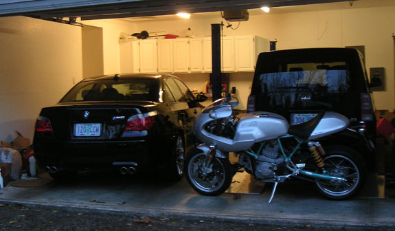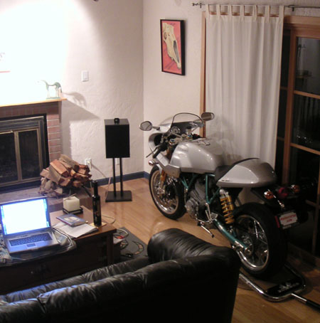 The short ride home was COLD. Despite the Roadcrafter suit with enough layers under it to make me feel like the Michelin man the chilly wind snuck in. In particular, the gloves were totally inadequate for the contitions and it got progressively harder to operate the clutch and brake. Having to mess with the visor to balance windblast and fog didn't help. Whatever attention I managed to give to the process of riding allowed me to conclude that the handling is very light and nimble, engine is torquey but not too powerful, a gear whine of sorts dominating the audio. Which is cool, though I might switch exhausts in the spring, perhaps going to a 2-1 system with a single can. Dual ones look a bit bulky. But all that can be dealt with later. In this weather the best way to enjoy a motorcylce is to stare at it while sipping chianti by the fireplace... So, after the obligatory garage shot I pulled the new arrival into its winter home and raised a toast to the many memories yet to be made.