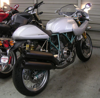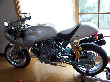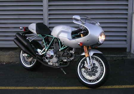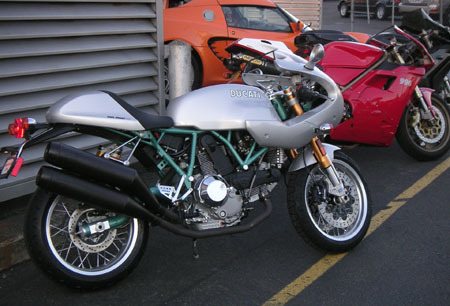 12/16/05 Some two years ago, when Ducati first showed the Sport Classic prototypes, I instantly realized two things. First was that I wanted one (the bubble-fairing version, named after Paul Smart to commemorate his victory at Imola in 1972 which put Ducati on the map). The second thing I realized was that the 'prototype' was too well finished to be just that - this was headed for production. So I called Motocorsa, my local Ducati (and later Lotus) dealer and told them to put me on the list when there is one. Sure enough, a couple of months later it was confirmed and the long wait started... I even picked out a place in my livingroom where it would sit :) Fast forward to the present. I've actually known that the bike is in town for a week or so but having the M5 to play with I was distracted enough to let the dealer put it together and take care of the paperwork in peace. Today being one of the last dry/sunny days in the forecast, it was time to go retrieve it, nevermind the 28F temperature and patches of ice on the roads. Arriving at the dealer, some formalities and then the first introduction in the flesh (I pretty much knew what to expect having seen the bikes being built during my factory tour in July). Cool :)