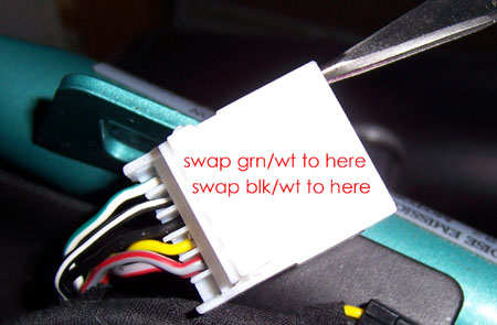 Right now it's just held in place with zip ties for test fit, I'll drill the holes when I bring the drill back from the shop. Only question that remains is how to mount the license plate. I wonder if I can just use industrial velcro to attach it to the battery, ahead of the rear wheel. It's just the right size. I've seen plates mounted in this location on highly modified bikes so while it's probably not legal as such, one could possibly get away with it. Besides, this bike is not going to see much street use anyway so I'd be willing to take the chance. UPDATE: Decided to go ahead and finish the job. So, the three holes were drilled and the two wires swapped in the connector. The latter took a bit of doing but basically you need to reach inside the connector from the front with a sharp instrument and bend the plastic retaining tab back from the pin while pulling on the wire. There is one position that does not have a pin so practice bending the tab on that one first. Ultimately very doable and clean (and reversible if need be).
