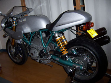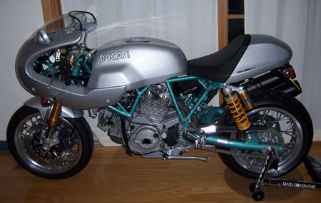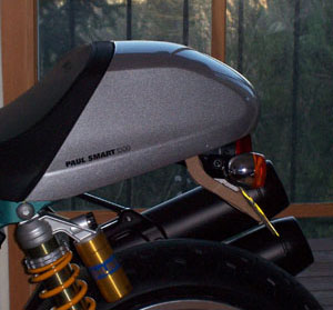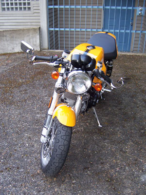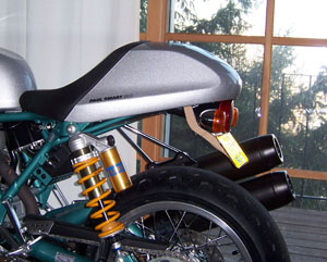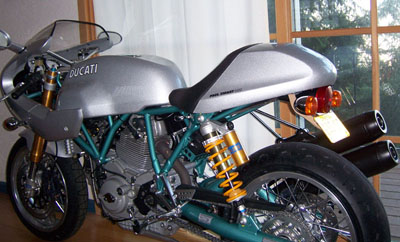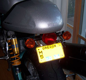 If the zip tie moves down more than that, crank in more preload (add approximately the difference between the actual and desired travel, which may be a good inch initially), then move the tie all the way up and repeat. Note that this procedure is very approximate but it should get you in the ballpark. It may be useful to keep the zip tie on as you ride so that you can see the actual shock travel in use. If you're considering doing these mods to your Ducati, check out the separate page with detailed instructions for the fender removal and bracket install. Have fun! 04/01/06 One of the PS1000 owners who bought my bracket has come up with an alternative way of mounting it that provides more tire clearance and makes the bike look less stubby, so I've updated the instructions to include it - many thanks to David Hood for the design and the photos. Today I helped Tracy pick up her new Sport1000 and of course we put a bracket on her bike too. Works well with the shape if I do say so myself. I really like the bike, it's has a very different character than the PS and is quite fun in its own way. If I didn't have so much on my plate already I'd be tempted to get this one as well. As it is, I'll just have to borrow Tracy's every now and then. The mirrors work way better, too. Pretty unique as far as factory setups go.