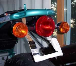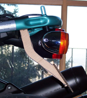 01/23/06 Upon perusing the Oregon Motor Vehicle Code I confirmed that the rear plate needs to be displayed 'in plain view'. Chances are, sticking it to the battery is not going to qualify as such.... So, whilst once again staring at the bike, I visualized a license plate bracket that would mount to the stock locations, again using stock hardware. A few measurements, some time with SolidWorks and two cardboard prototypes later, I have a design: