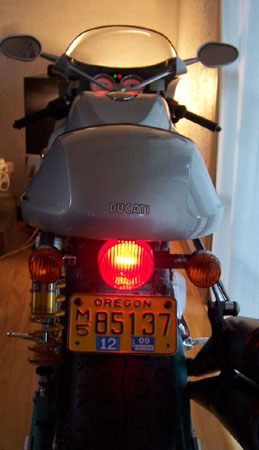 When it's on the bike you can't really see the bracket, the license plate just seems to float below the taillight. I checked the tire clearance with me bouncing up and down on the seat and there seems to be plenty. I don't see it rubbing in any reasonable situation short of doing motocross jumps (and if that were on the agenda the bracket and plate can be removed in less than a minute :). Overall the mods clean up the look of the bike considerably and save 2 lbs to boot. Since the brackets are laser cut, CNC bent and powdercoated, it made sense to make more than one. So I now have a few for sale at $115 each. If you want one, let me know. A note on tire clearance, since someone asked - I had adjusted the spring preload on my bike for about 1-1/8" static sag at the rear (about 7/8" travel on the shock) and with that the rear wheel has 2-1/8" clearance to the bracket with me on the bike. As-delivered the bike had nearly 2" of static sag with me on it (180 lbs) which would only leave 1-1/4" of clearance. This I'd consider a bit tight. So if you get one of these brackets I'd highly recommend setting the rear preload to about 1" static sag, which is the generally recommended number for sportbikes. If additional clearance is wanted without increasing preload, the shock itself is adjustable for length so that's another option. Interestingly, the front is set up for only 1/4" static sag (I checked the other two Ducs and they're even less, at about 1/8") while some sources, like this Sport Rider article, seem to recommend around an inch at the front as well. Hmm... Another question came up about lighting for the plate at night. The stock plate light is removed, but the way the plate is positioned it ends up being illuminated by the taillight.