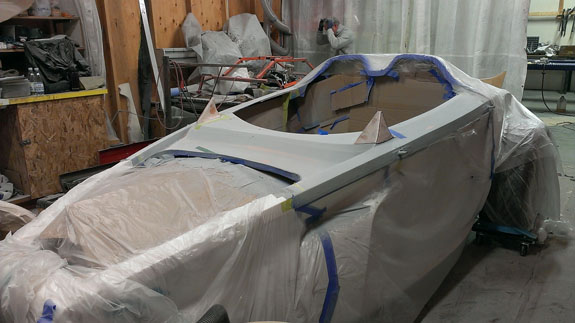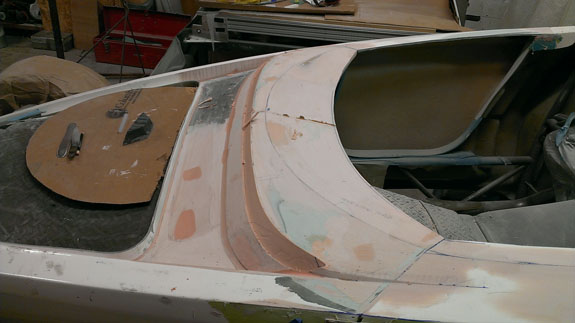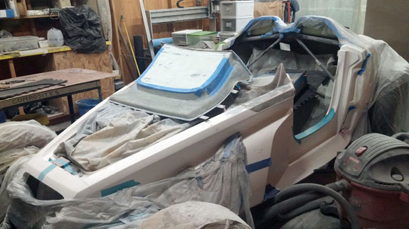 12/5/14 Some more progress on the cowl/windshield area. The windshield support shape has been finalized and the area is prepped for molding. Since everything is built up as a mixture of aluminum, fiberglass and bondo we're going to take a mold of the modified shapes, then cut out the temporary build up, make a replacement part in the mold and then bond it into the existing bodywork. This will ensure that the new area is as strong as the rest of the body and won't crack from vibration on the road. The mold will also be used to make 'splices' for initial production bodies until we can create updated tooling. Yes, Stiletto will be offered for sale as a kit with third-party assembly options like the D2, at similar pricing. We are going to be making the chassis and the rest of production details are still being worked out. Contact me for details.
