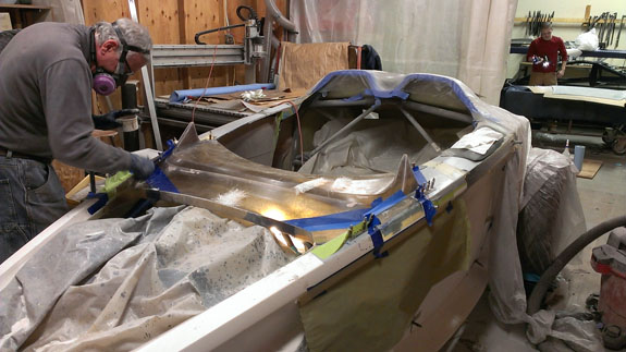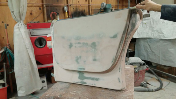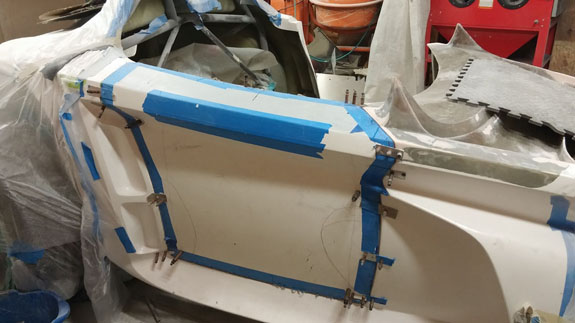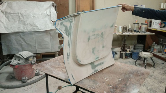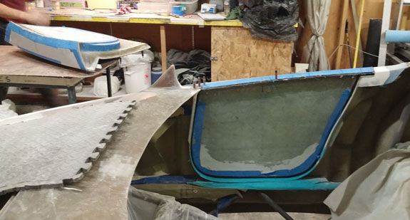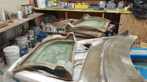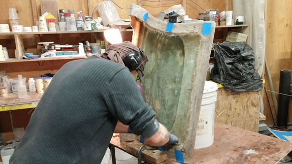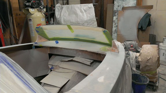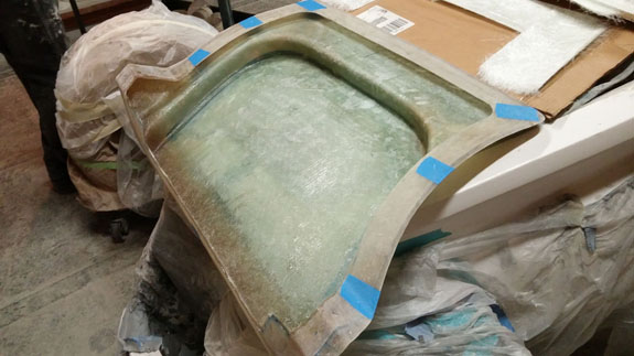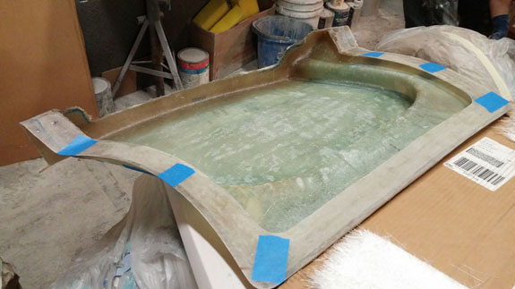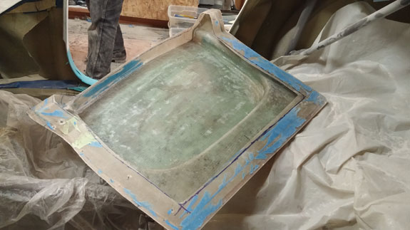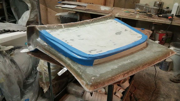 Next the center section is waxed, sprayed with gelcoat and the mold is laid up. After that the fences are removed and the end pieces of the mold are laid up against the center.