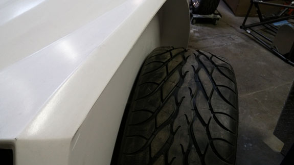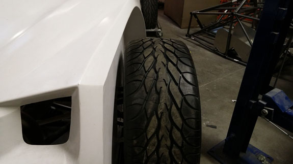Once this is all done I'll get going on the hinges. Have been spinning them in the in-head 3D simulator in the meantime. It'll be a bit of a challenge due to the shapes involved but looks doable. And good practice for the upcoming D2 door project. Related to bodywork, since the rear wheels were too close to the fiberglass we went ahead and made a new set of longer rear suspension arms. They're now powdercoated and fully assembled and will be installed when the messier parts of the bodywork are done. 01/28/15 On the D4 page I mentioned there is Stiletto progress so here it is. The longer rear suspension arms are now on and there's clearance to the bodywork. May not seem like much of a difference but functionally it's between not working and working.