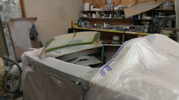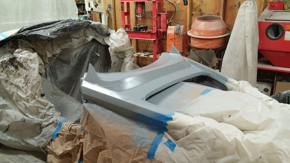 Could we have done it with just a spacer? Probably, but then there are other issues with bearings, stud length and so on. The more important point is that I'd rather just do it the right way. Cowl and door skins are now sanded, primed and ready for the next steps (such as door and hood hinges).