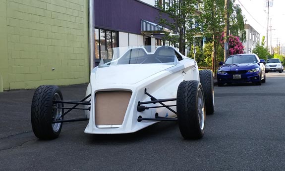 Lots of work remains (interior being not the least of it) but the progress feels good. It's also an ongoing learning experience, as always. It's getting there. In the meantime anyone interested in owning a Stiletto can email me for details. 04/20/15 Among all the other projects, Stiletto is moving forward as well. Right now it's all about the subsystems - plumbing, wiring, etc. The custom radiator is made and installed. Fits well. In the meantime I've realized that we've always taken pictures of the car in close confines of the shop and I was curious to see what it looks like out in the open. So we rolled it out in the street. Pretty cool, as it turns out :) Pix below (Tristan is included for scale). Yes, it's a 430hp, 1,900 lb car like the D2 and shares much of its chassis DNA.