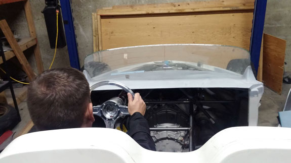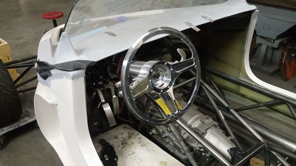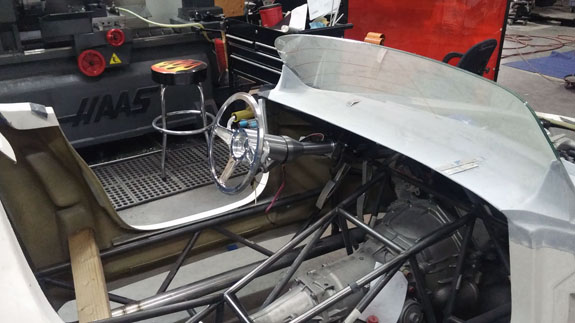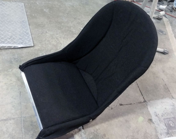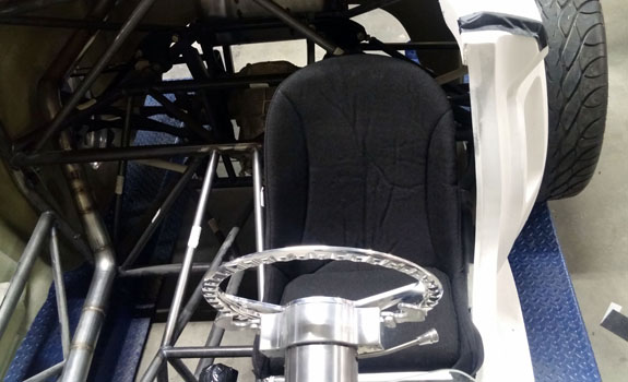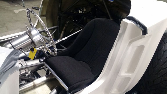 Work is also progressing in CAD on things like firewall, interior paneling, and the fuel tank. We couldn't find a tank that fits right so we're going to make it - just as well, since this gives us the opportunity to install reasonable baffling, which isn't normally present in tanks you buy off the shelf. Yes, it's a hotrod, but it will handle like a Palatov and therefore needs something to keep fuel from just sloshing around. It's gratifying to see this project moving along. Looking forward to driving it. 11/10/15 Got the seats. Looks like they will work. The Stiletto is a fairly compact package so I had to look for seats to match but which would allow a range of drivers to fit. What I found is 'Bomber' style aluminum shallow buckets. They are very comfortable, light, strong, and they fit. The stock covers are OK but down the line we can do custom upholstery. Getting it drivable is the first priortity of course. Right now the driver's seat is just in there on blocks. After a few more test fits and tweaks, making the real floor, panels, and seat sliders is next.