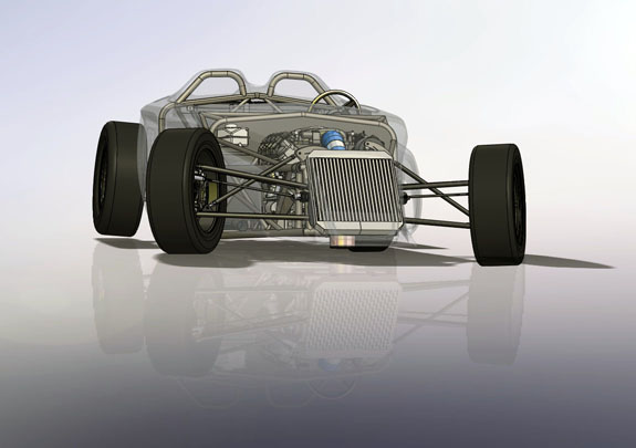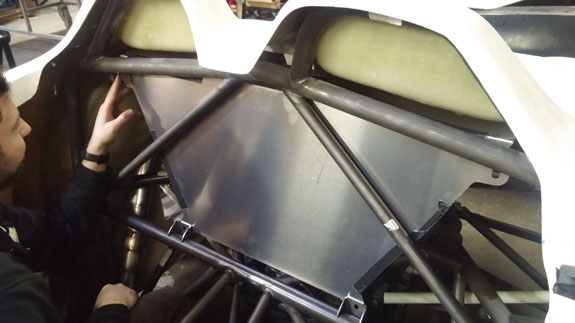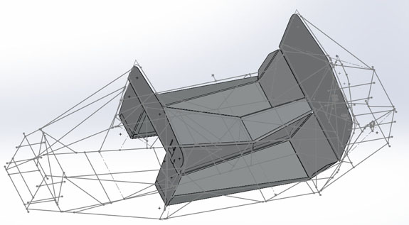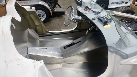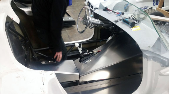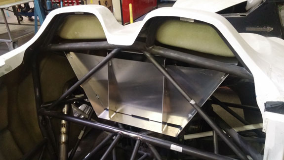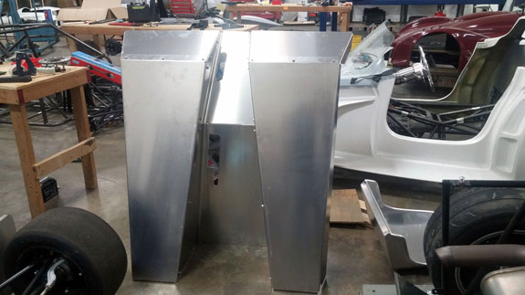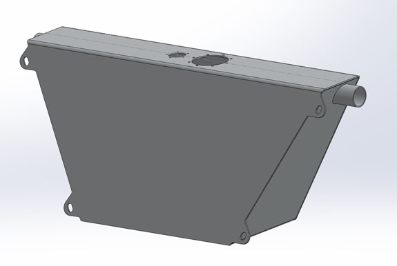 I've already gone through this cycle a couple of times but the development goes on and it gets reapplied to all of the cars, the Stiletto included. As a result I've now (again) ordered new shocks and considerably softer springs for the car. Fortunately we are able to use the previous parts elsewhere. All in all, we've gone from 600lb springs in the front to 450lb and now to 250lb. In the back, progression has been from 450 to 300 to 150. As originally designed the car would have been bouncing over every bump. Now it should be very compliant but still controlled, and will still corner flat without excessive dive under brakes or squat on acceleration. The lasered sheetmetal for the fuel tank should be showing up soon, at which point we'll weld it up and mount it. Ergonomics are nearly final and a lot more of the brackets, mounts and panels can now be finalized and made. 02/03/16 Fuel tank sheetmetal came in so Tristan welded it up.