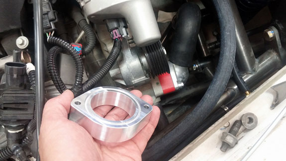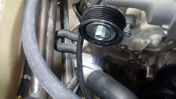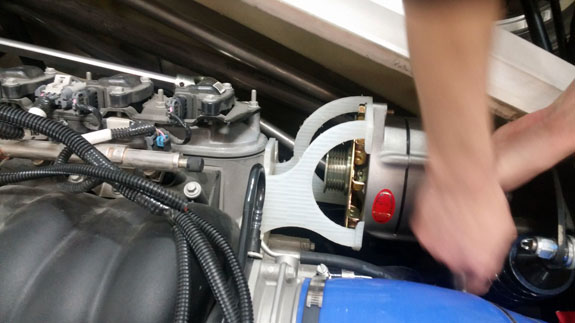 09/19/16 This being the first car of its type we're building, a lot of little details have to be figured out. The tight packaging in the engine bay has created several challenges, some examples of which are below. The water coolant tube routing meant that we had to turn the thermostat housing 180 degrees. That's the easy part. The problem is that now it interferes with the serpentine belt and had to be spaced out almost an inch. Jay created a quick 3D printed prototype (red in the first picture below), then I machined an aluminum part and we installed it.