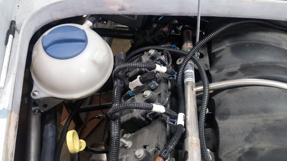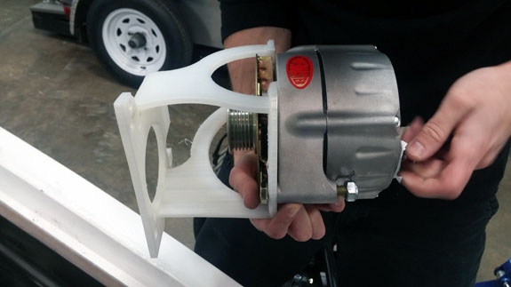 So now the engine bay is starting to look more complete. Once the alternator is mounted and coolant is filled, and the rest of wiring harness is fabricated and mated to the engine harness, we just might be ready to try and start it. 10/24/16 After a few 3D printed iterations, we finally figured out the alternator bracket so the design was detailed out and laser-cut sheetmetal ordered. Once it all comes back we'll weld it, figure out the right belt length, install and then see how it all works.