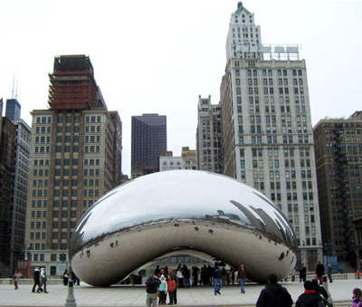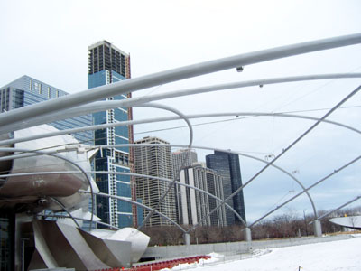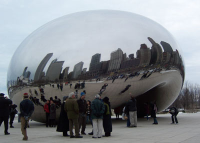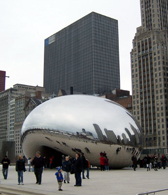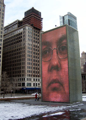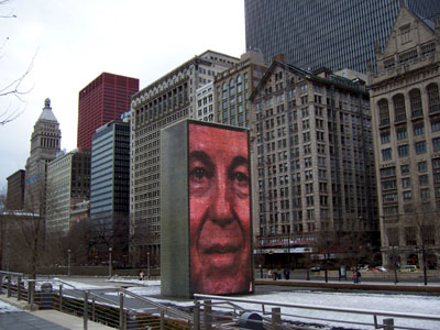 Millenium Park on the lakeshore is an interesting place. There are two towers on which people's faces are projected. The faces change expressions every now and then. I'm told in the summer it's a fountain, with water coming out the face's mouths at various times. Cute.