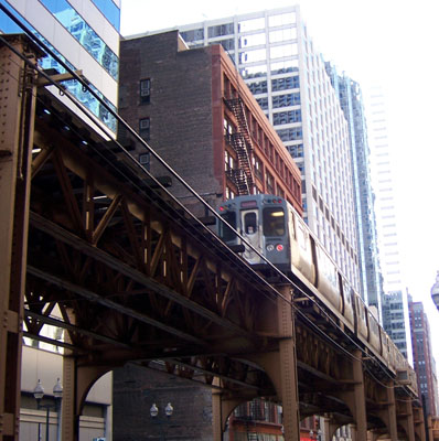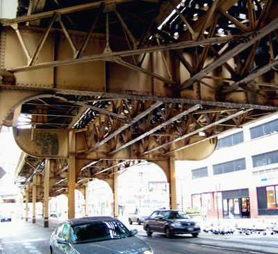Beyond the skyscraper forest the flat, featureless landscape stretches forever.... Then it's back down to roam the streets with no particular destination or agenda. Just to see what's there. The elevated railway has a very industrial look to it, with the riveted trusses and worn out paint. The trains occasionally rumble overhead, throwing off sparks as they go.