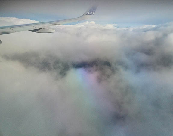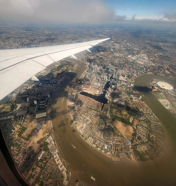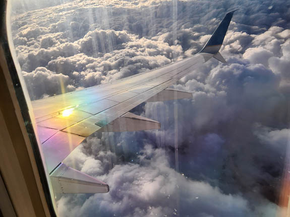 Bracing for a lot of hassle at the airport, I am pleasantly surprised by smooth check-in. Bags checked and through security in 14 minutes flat. But it's a long trip, so we'll just see how it goes. Doesn't look like I'll be getting upgraded today. Oh well, no big deal. The flight is uneventful but there are weather delays in Denver. Makes for some cool pix, especially when using polarized sunglasses as filter (the rainbow ones). On the down side, that leaves me 8 minutes between planes for my connection to London. Will I make it? Will the luggage?
