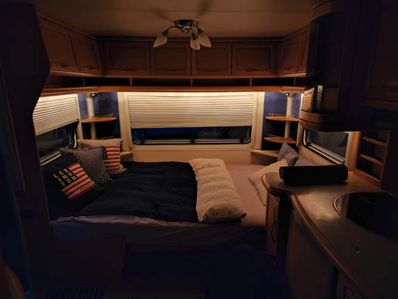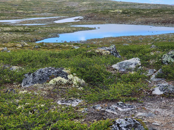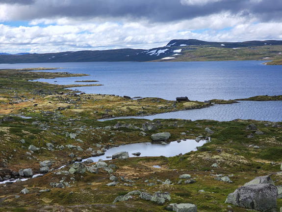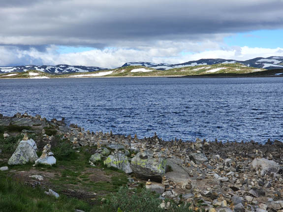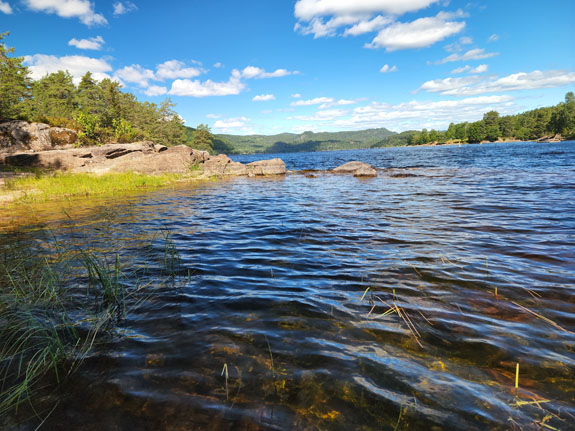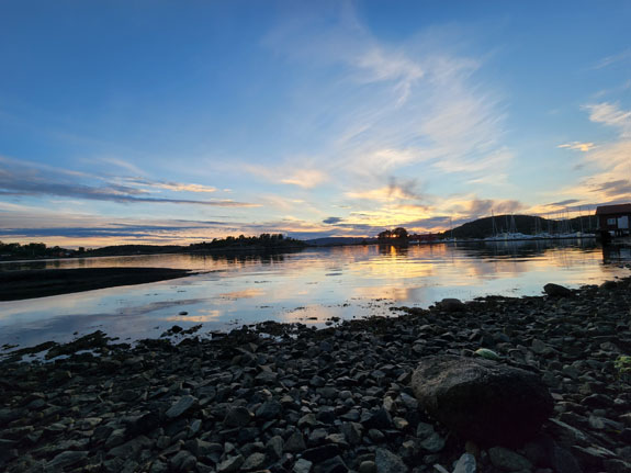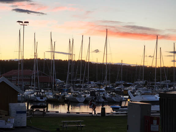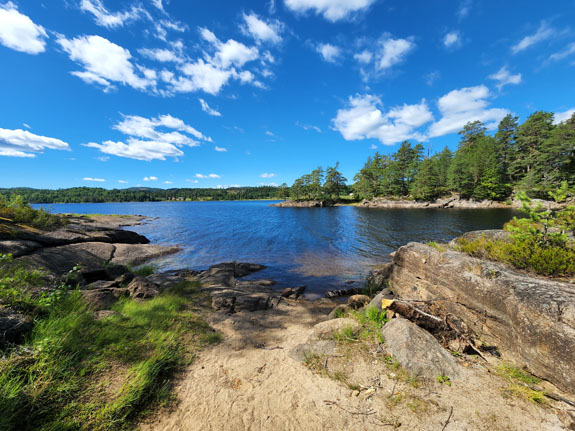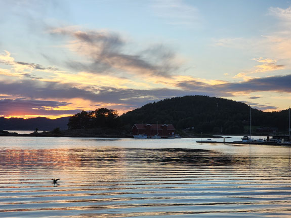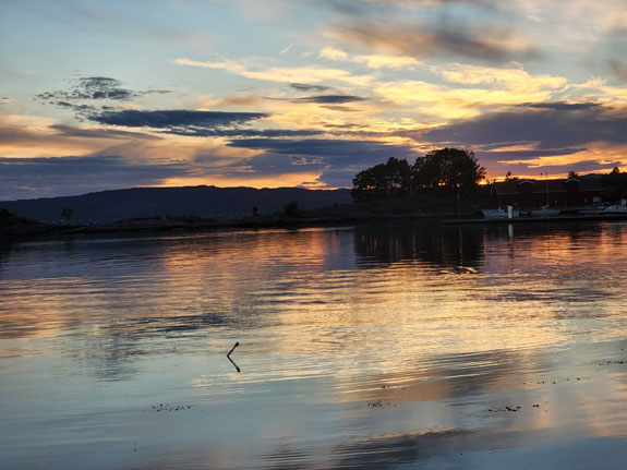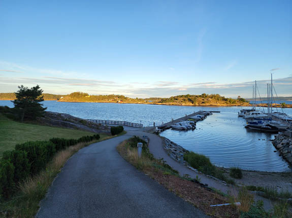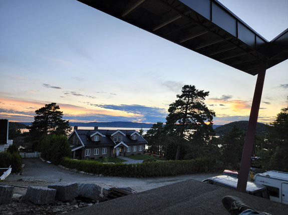It's cold, about 5C, with what feels like 15-20 mph wind. Nope, not kayaking here either. After the pass the scenery becomes less dramatic, the rain stops, and by the time I pull into Larvik it's 22C and sunny. The final stretch of road is divided highway and after many hours of 60-80 kph limits, 110 kph (68 mph) feels 'fast'. We get used to things. From Bart's house we walk one kilometer through forested area to a nice restaurant for dinner and talk. The walk back feels satisfying somehow. Walking to and from dinner is good. When we return it's well after 9 pm and I borrow Bart's wifi to find a campground. It's on a lake, about half hour away. Fortunately the sun doesn't set until almost 10:30, so I find the place and set up with plenty of daylight left.