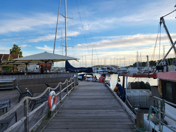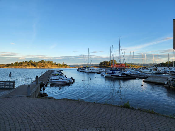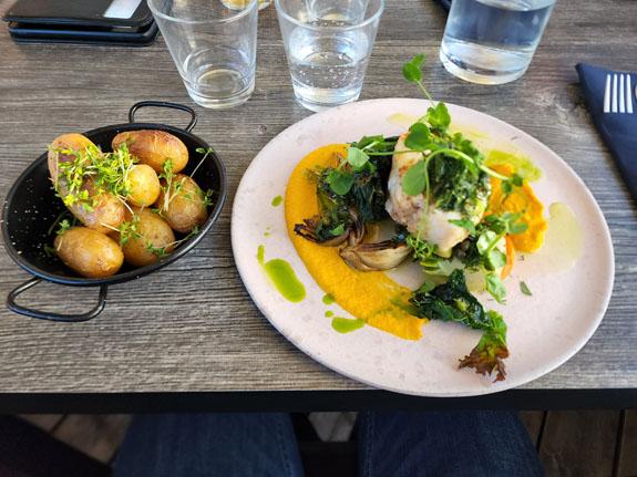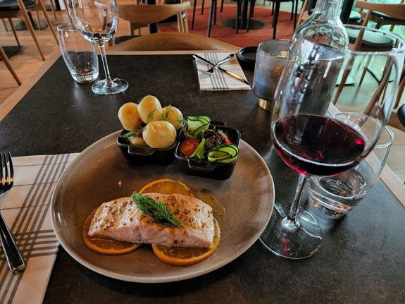 Arriving at Vegard's I take a much needed nap, and then he, Grete and I walk about a kilometer to dinner. Seems to be a thing. The walk is very scenic, and the meal of monkfish is great.