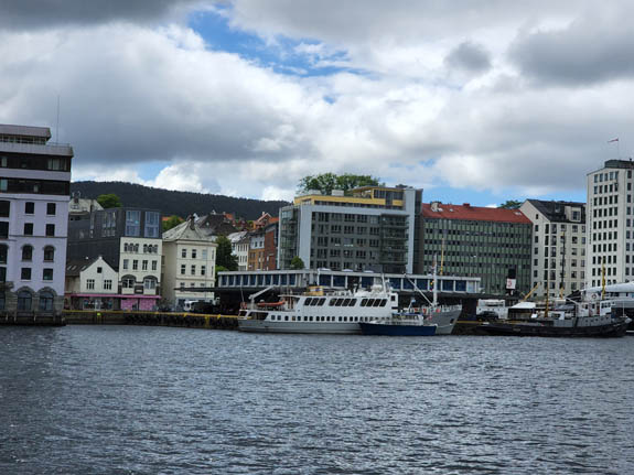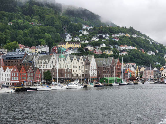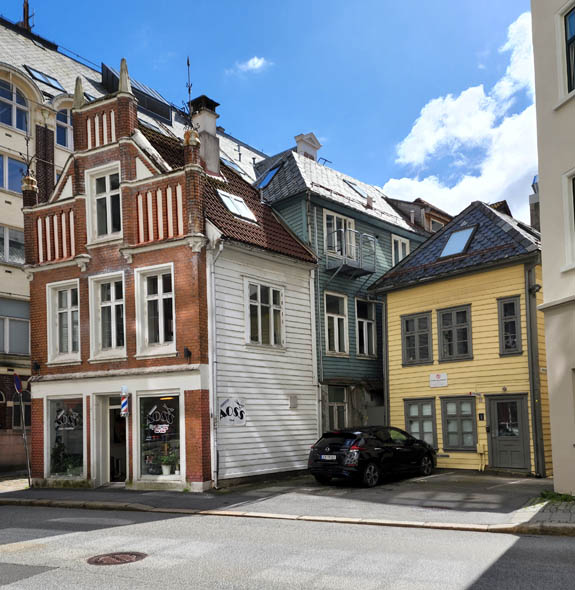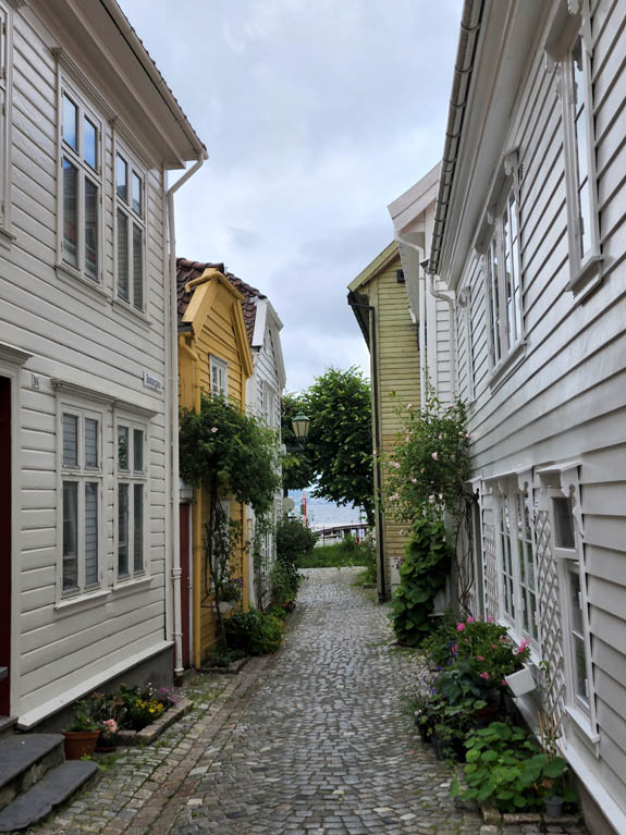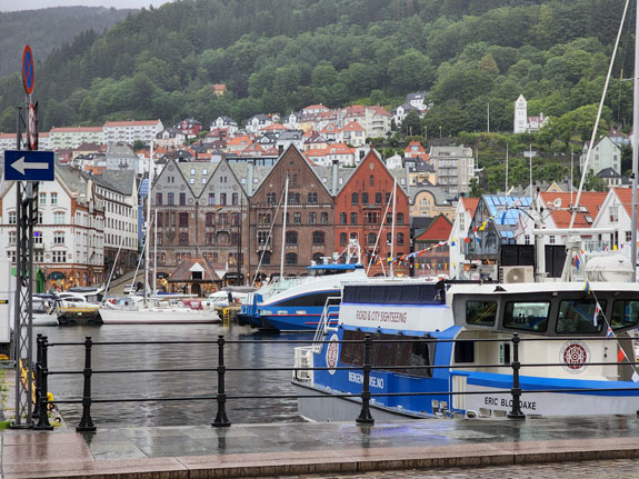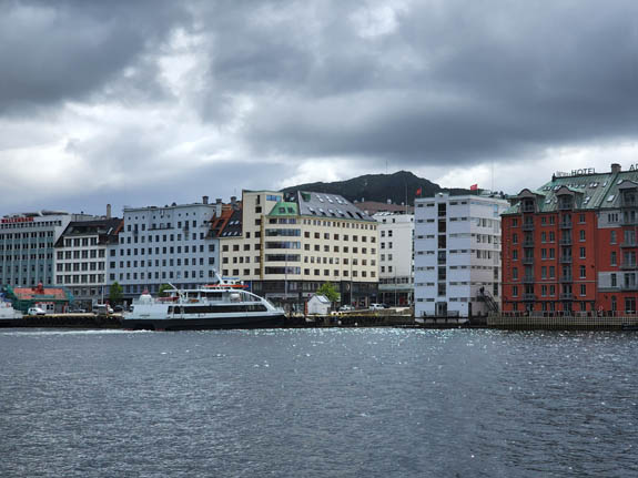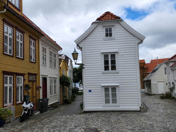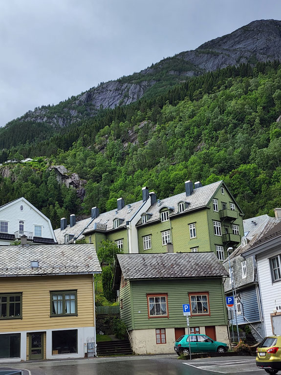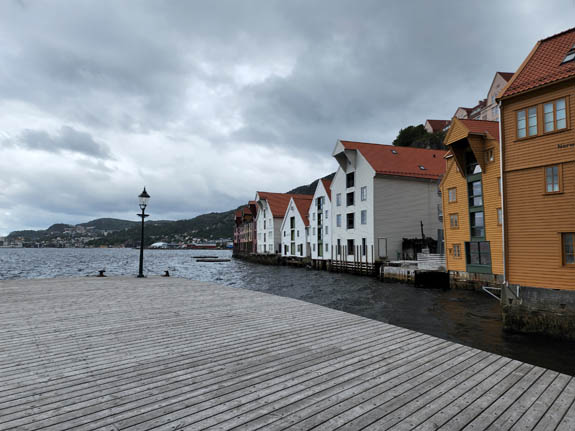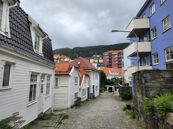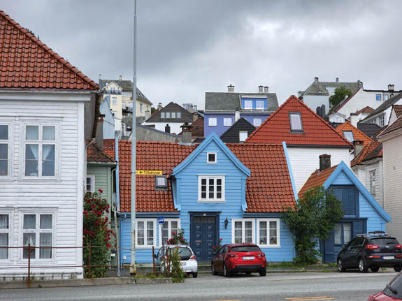 I've been warned about speeding here because the fines are very heavy. So generally I'm careful to stay at or under the limits, which change frequently. Google warns of camera locations with a chime. Still, I may have missed a transition from 80km/h to 60. I guess if I got fined it'll show up on rental car bill. As will the electronic tolls which happen at many spots along the way. It will be what it will be. I didn't know what to expect in Bergen, and was very impressed on arrival. The place is cool and beautiful, staying within the apparent style guide but with a unique character. The blue house is an exception of sorts, but isn't really. Certainly stands out.