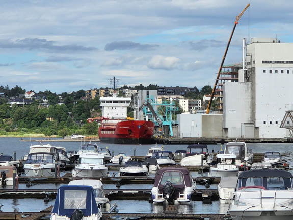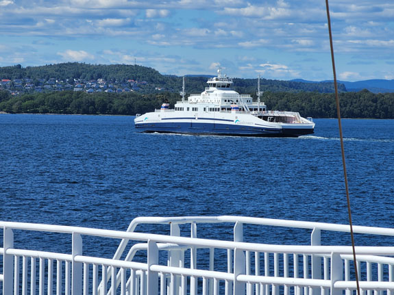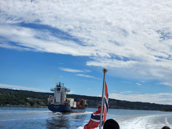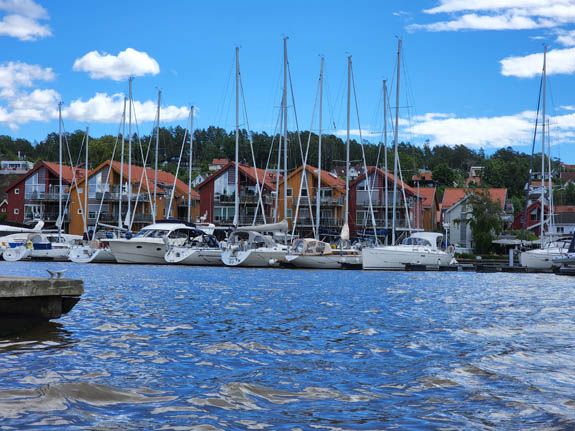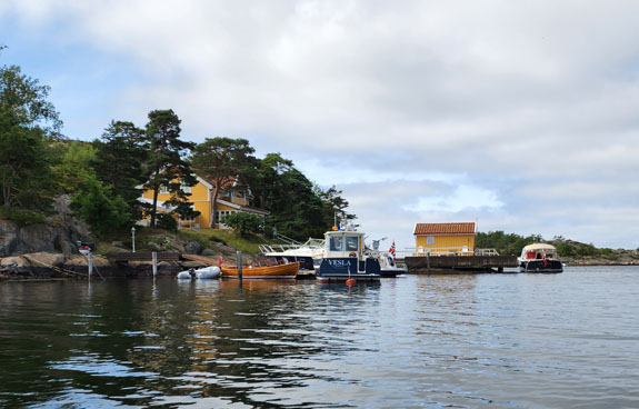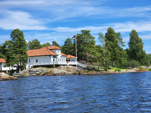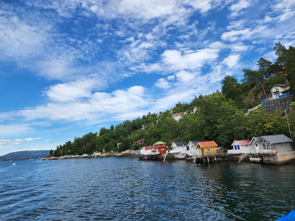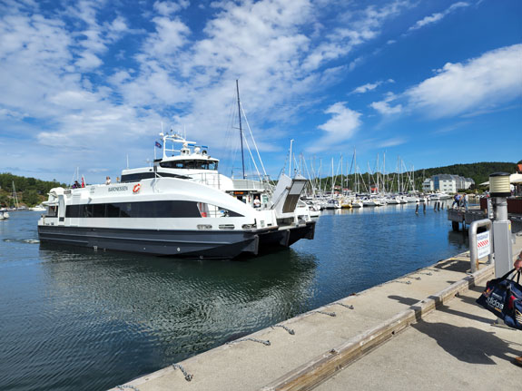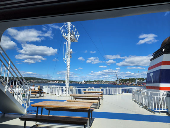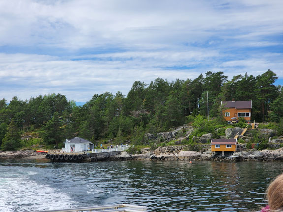 The boat is part of regularly scheduled service, another 'water bus'. It takes two hours to reach Oslo and makes about a dozen stops along the way. Some are towns like Son, some are tiny islands with a handful of houses on them.
