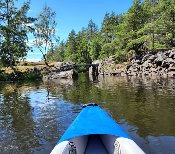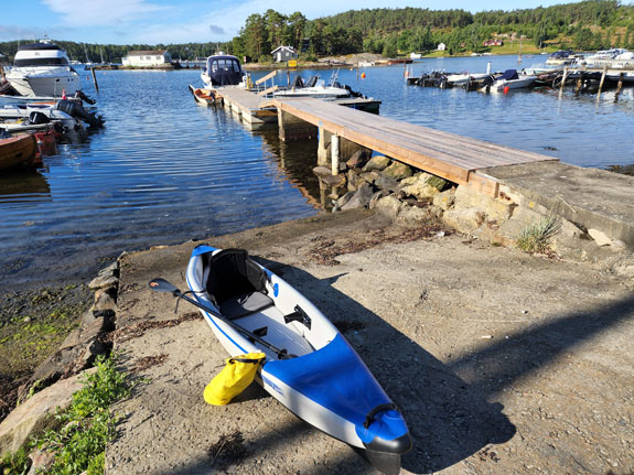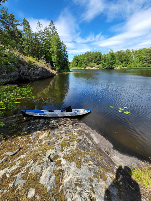 Perhaps I'll get lucky and see it sail later. Vegard manages special vehicles of all kinds for movies produced in Norway, and he has hired this ship in the past for one of them. Unknown why it's here now but very cool to see. We both marvel at the fact that the Vikings crossed the Atlantic in ships like this, and smaller. So many experiences already and this was only day 2. More than a week to go. Looking forward to it. 7/6 Another paddle today - this time on a lake, launching from Moss, a town just a 15 minute drive from Son. Ends up being 3 hours in the kayak and 1 hour on foot exploring the town. There is a parking lot with access to the lake, so I set up and launch from there. The lake is a different experience from the fjord, and reminds me of a childhood paddle with my parents on Ladoga lake in Russia, which is one of my earliest clear memories. Coincidentally that was in a folding kayak, this one being inflatable is similar. The granite rocks, the lillies... Cool.