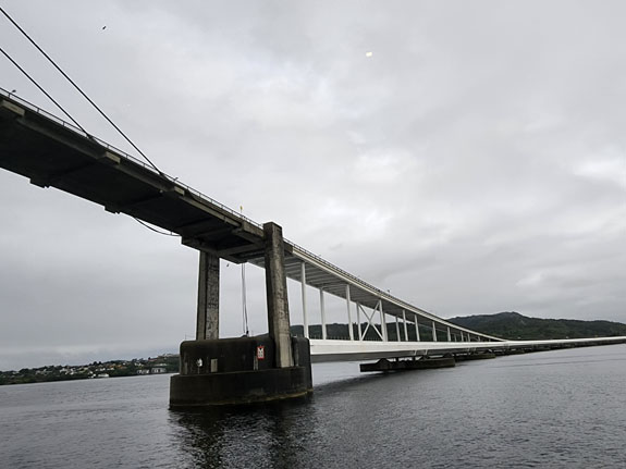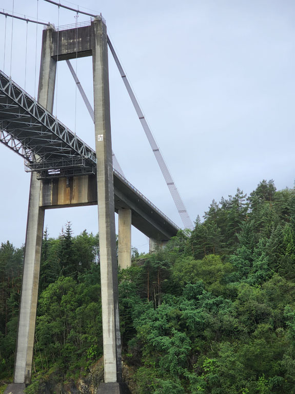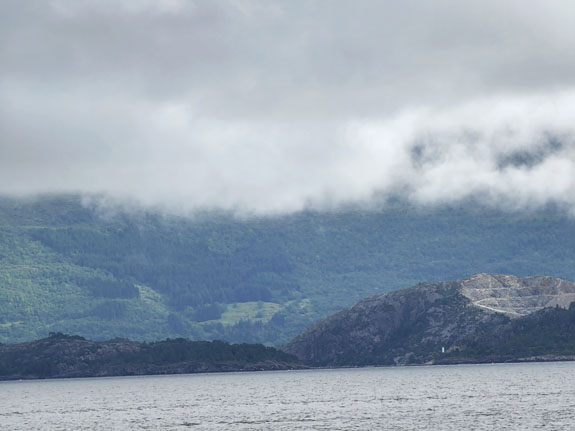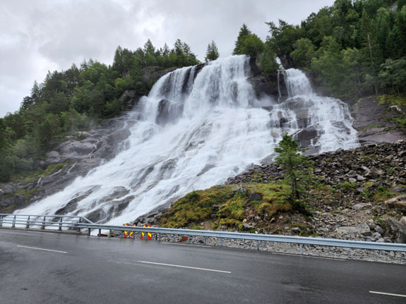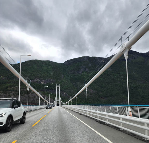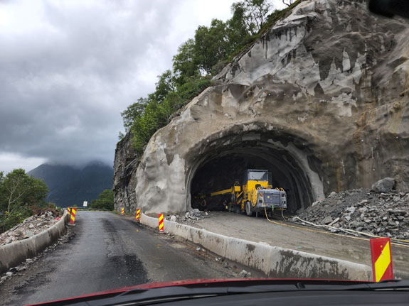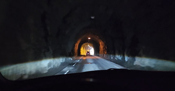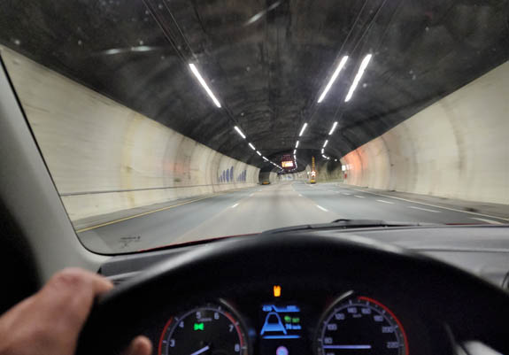 Starting the car to drive off the boat, a tire pressure warning dominates the dash. I find a gas station and fill the tires, two of which were below 30 psi. Hope that's all it is and not a puncture, which would be a pain to deal with. The next road is quite interesting. Narrower still, with several construction zones, and culminating in the 11 km long tunnel at the other end of which is Odda.
