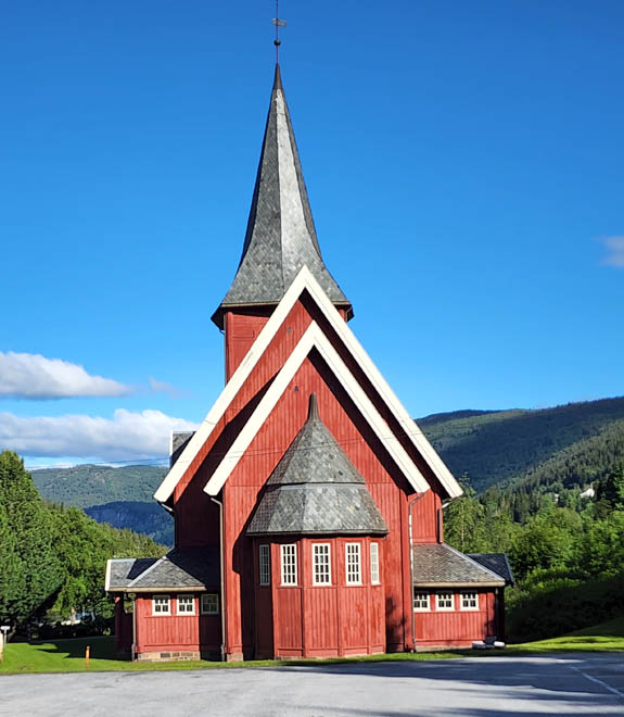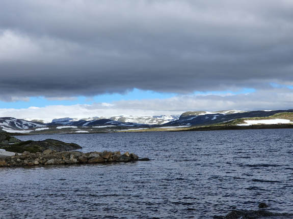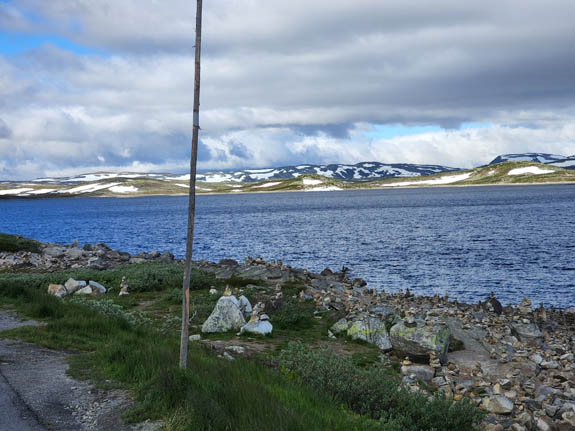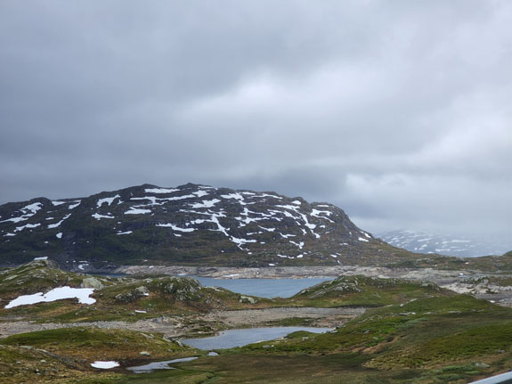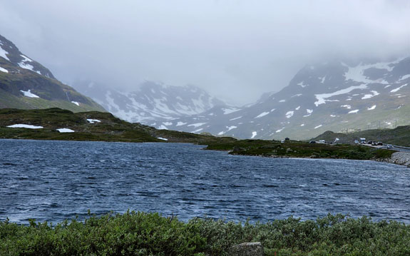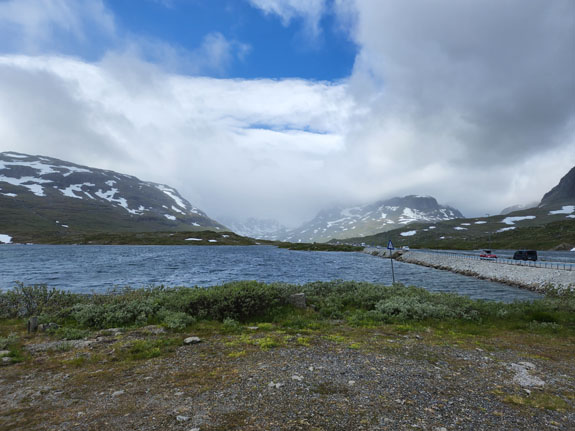 Descending the other side of the pass there are many dramatic views and mountain lakes. And more tunnels. I'm starting to get low on fuel but make it to a gas station with no issues. Car takes 29 liters of gas for around NOK75,000 which is $75 in USD. About $10/gal but fortunately the car's fuel economy is quite good. I haven't kept track of miles traveled but it's been many hours of driving.