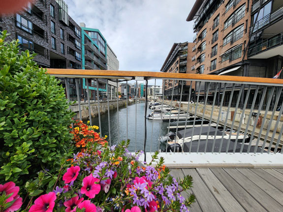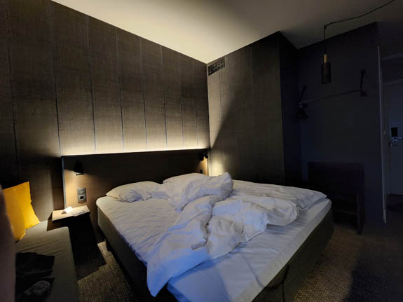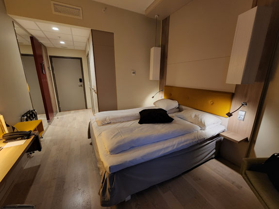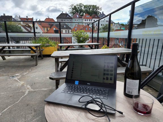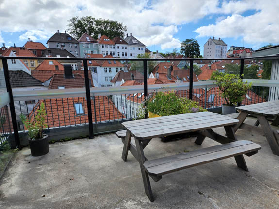The hotel (Comfort Hotel Bergen) is nice and only a 5-minute walk from where the fjord cruise leaves tomorrow morning. It has a nice rooftop deck area, which I use to write this update. The room follows the style guide too.