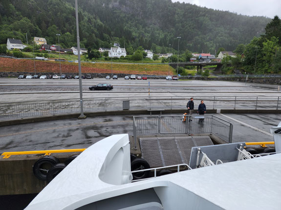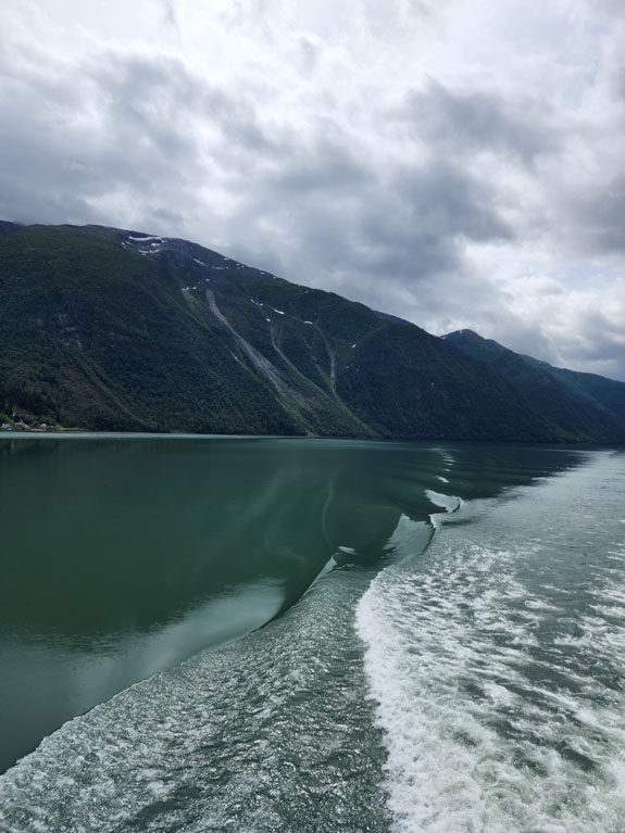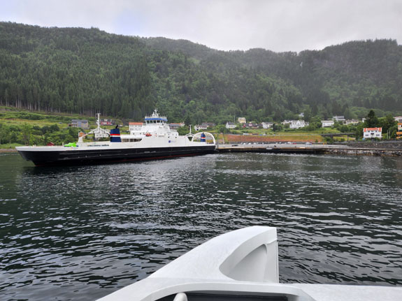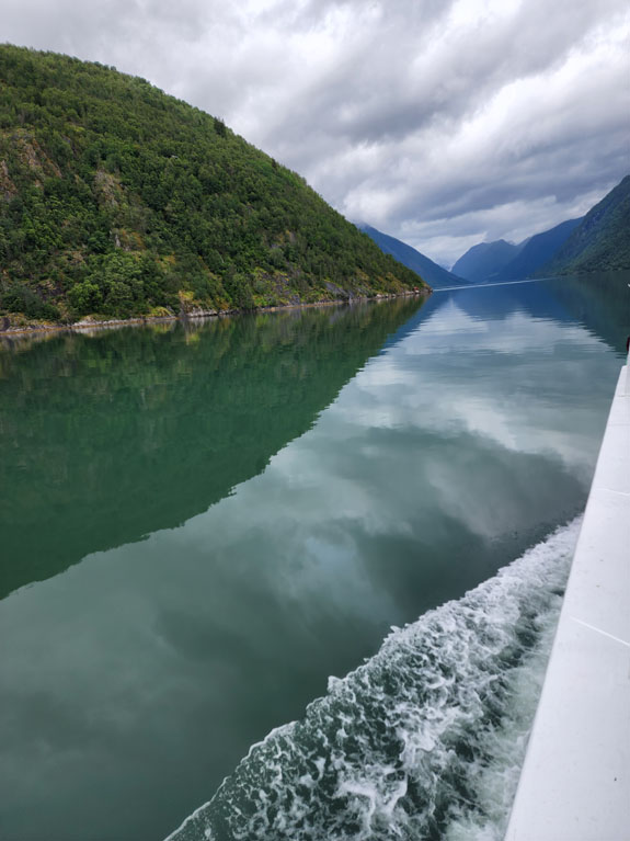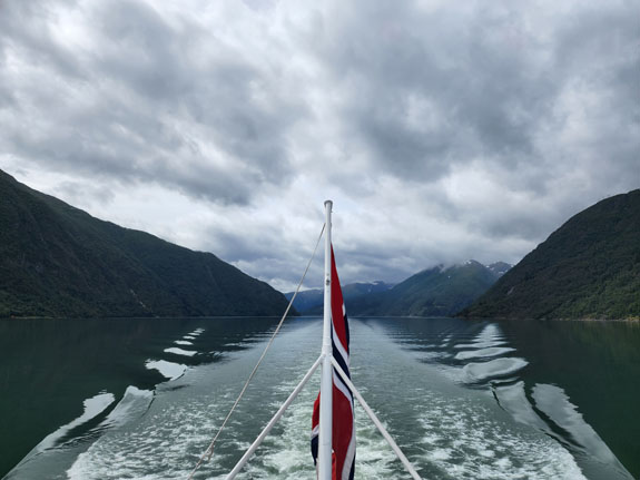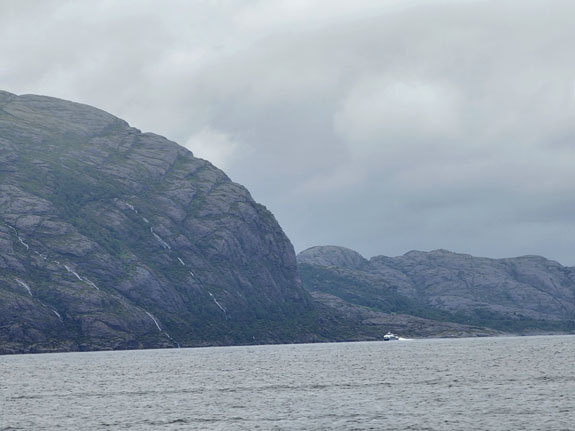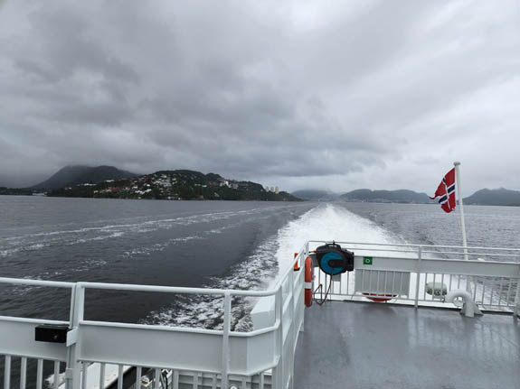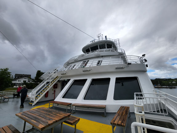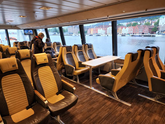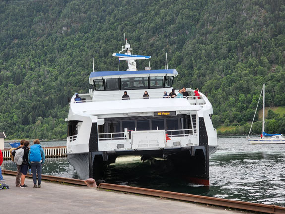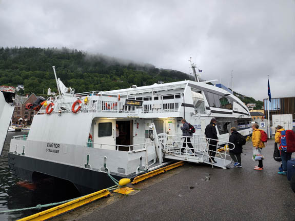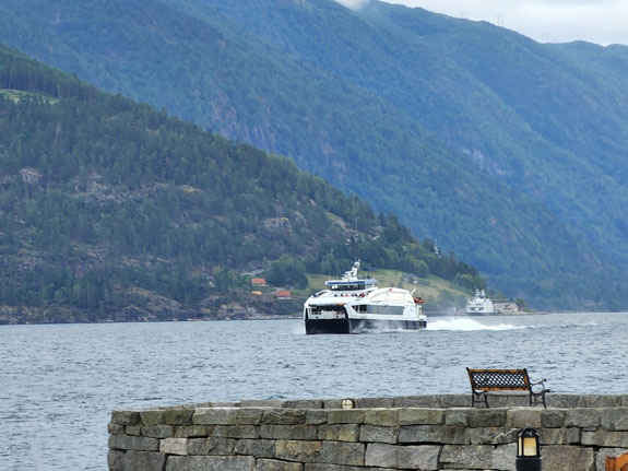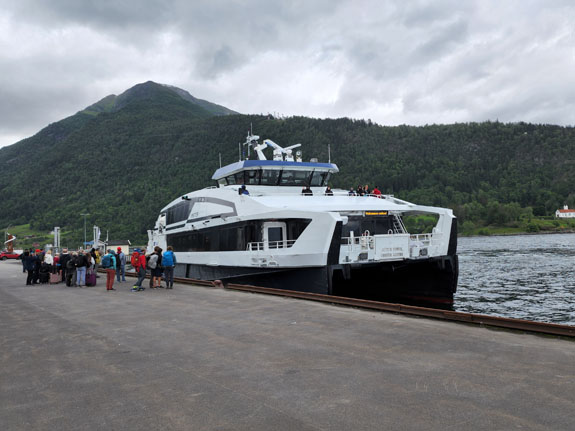 This portion of the trip is on a regularly scheduled catamaran, it's basically a water bus that makes several stops in the fjord. And it goes fast! About 30 knots. An impressive machine, built by Oma in Norway.