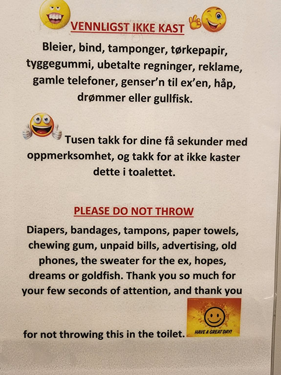 The sign in the toilet is humorous :) Because hopes and dreams can really clog up the works.