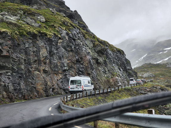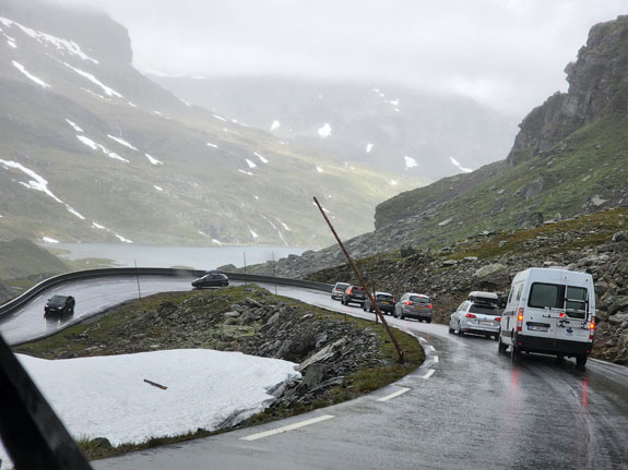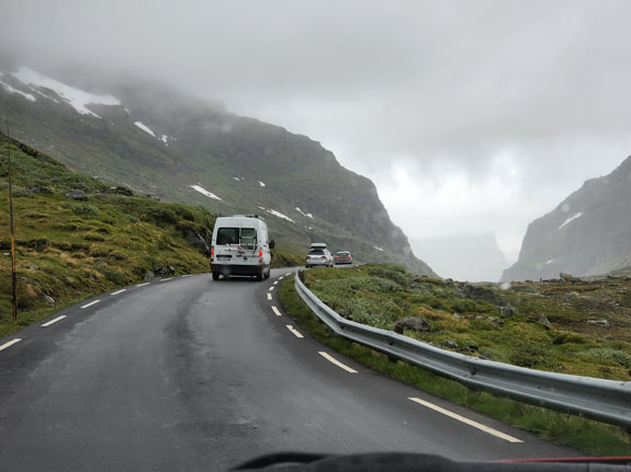 My next destination is Larvik where I'm meeting Bart for dinner, and then hopefully finding a campground to stay the night. It's about a 5 hour drive from here over a mountain pass. A tunnel along the way is closed for maintenance so there may be delays... and there are. Turns out they are routing the traffic from a 2-lane highway through a 7 kilometer, one lane winding bypass. So they do it in alternating groups from each direction. Takes a while.