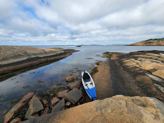I fabricated the wheel bar just before the trip out of aluminum rod, a pair of cheap plastic wheels off Amazon, and some clips. Works great! Getting the boat up and down the rocky slope was pretty effortless. The paddle went perfectly, going around an island, visiting the harbor, and returning just as wind and clouds were starting to come in.