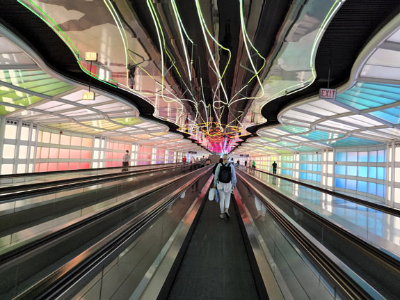 - While the actual passport control in Chicago is done pretty well, the fact that you have to wait to get your checked luggage just to check it right back in again after carrying it 50 feet is ridiculous. What's the point? Didn't have to do it on the way out. - Airport layout is annoying. There are several United Club lounges, not all of which accept one-time passes. Not to be confused (except by me) with Polaris lounge which is a whole other thing. At least I got some exercise walking. And I have a 3-hour layover which became 5. The food in the Chicago club lounges is way worse than London. The only thing it's got going for it is that it's 'free' (with lounge access). The lights in tunnels between terminnals are colorful, so there's that.