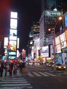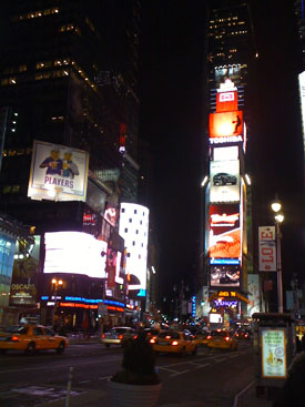 After a stop at the hotel we headed out to East Village for some Indian food, stopping on the way at a liquor store to get a bottle of wine which I then stuffed into my coat pocket for later. The hotel staff had recommended a particular place on 1st Avenue. It is a single building housing four separate Indian restaurants and when potential customers approach, waiters from all four leap out and each try to guide you into their restaurant. I've only seen this in much seedier settings before. The particular establishment recommended to us is the one on the far right when facing the building so we let ourselves be ushered there. The interior is tiny with a crazy combination of sparkling red walls and hanging lights. Cool! The food proves to be excellent and very reasonably priced. It really hits the spot - perfect. A great experience. Stuffed full of spicy Indian food the walk back to the subway is much warmer. It is still fairly early, about 10pm, so we decide to go a couple stops further to Times Square, peek out and see what's there. It is the stereotypical image of New York as most outsiders (including ourselves) see it.