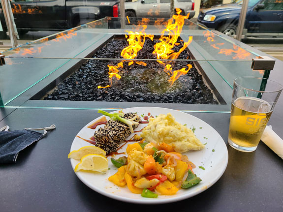 When I travel I normally exist on Zone bars (used to be Balance but the taste changed over the years so Zone is now the go-to). And since I'm driving rather than flying, I brought several bottles of red wine, a corkscrew, and a virtually indestructible glass that I made when I took a glass-blowing class. This works well with no time or thought wasted on 'refueling'. But when I see an interesting place to grab a bite, I do it just for the experience. This was the case in Seaside, where the outdoor fire pit tables looked interesting. Ended up being a good meal and experience, the first restaurant meal for me in probably 10 months.