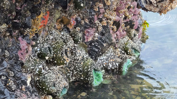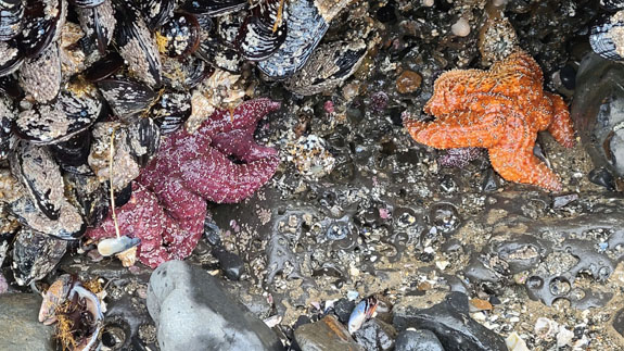 The starfish cling to the rocks exposed by the tide. At night wind picked up and wave noise increased, although could not see anything in pitch darkness. Then the morning revealed a high tide with waves breaking against the hotel retaining wall.